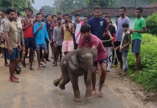 हाथी शावक के साथ खेलते नजर आए बच्चे।