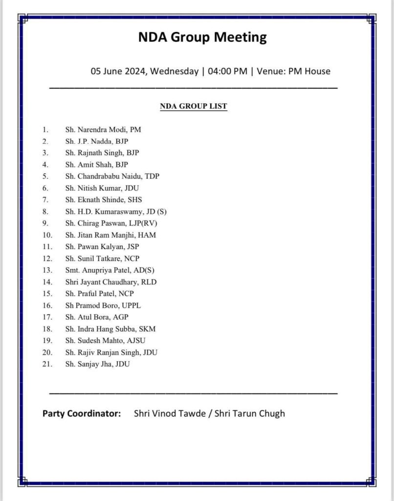 जबकि नीतीश कुमार ने भी साफ कर दिया है की जल्द से जल्द nda की सरकार बने और चंद्रबाबू नायडू ने भी मोदी को प्रधानमंत्री मानते हुए एनडीए के साथ पूरी तरह होने का दावा किया है । लेकिन दोनो नेताओ के पुराने इतिहास की वजह से राजनैतिक गलियारों में चर्चा का बाजार गर्म है इसलिए बीजेपी पूरी तरह पुख्ता होने की वजह से एक बाद फिर 7 जून को सुबह 11 बजे अपने घटक दलों के साथ बैठक कर सुनिश्चित करना चाहता है की एन वक्त में कोई साथी उसका साथ न छोड़े । इसलिए 7 जून को ही राष्ट्रपति को समर्थन पत्र सहित सरकार बनाने का दावा पेश किया जाएगा और 8 जून को शपथ ग्रहण समारोह होगा .?