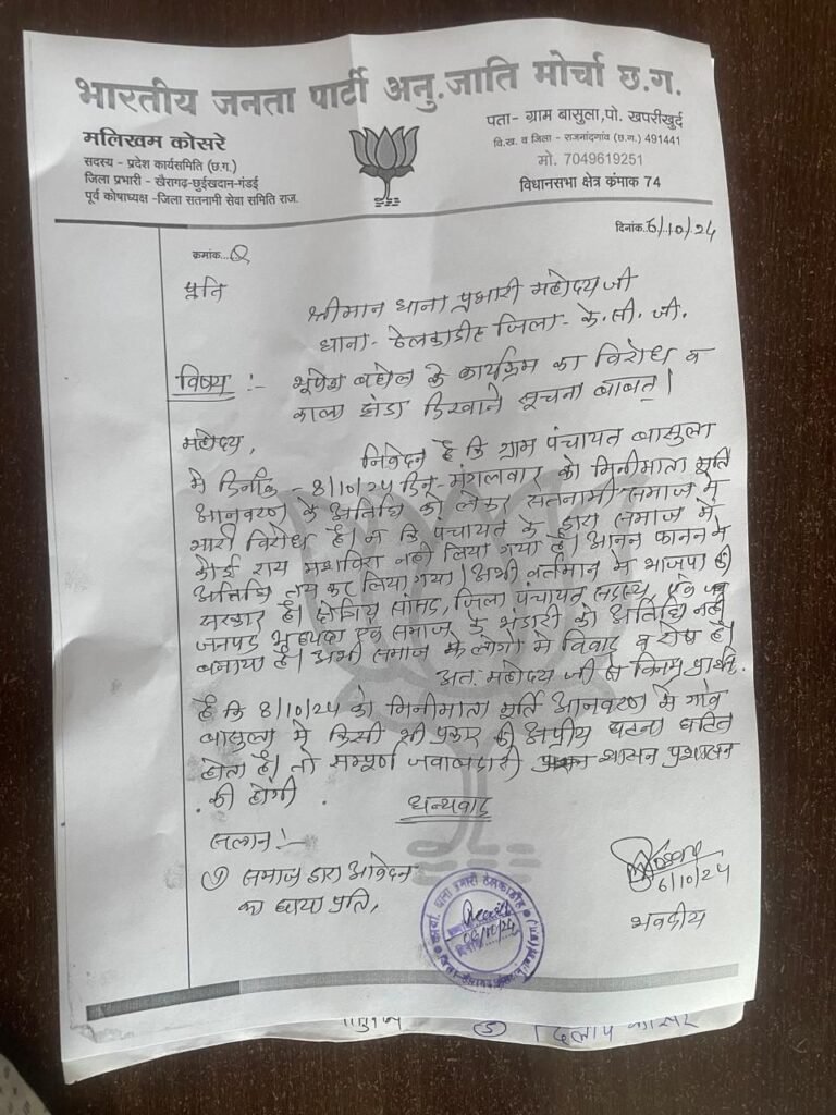 भाजपा अनुसूचित जाति मोर्चा ने कार्यक्रम के दिन काला झंडा दिखाने से संबंधित ठेलकाडीह थाने में पत्र भी सौंपा है। पूर्व सीएम भूपेश बघेल और विधायक हर्षिता स्वामी बघेल को काला झंडा दिखाया जाएगा। ग्राम बासुला में मिनीमाता मूर्ति आनवरण कल होना है। पंचायत के किसी भी जन प्रतिनिधि और सतनामी समाज के प्रमुख व्यक्ति से सलाह मशवरा नहीं लिया गया है। जिसके कारण समाज के लोगों आक्रोश है।