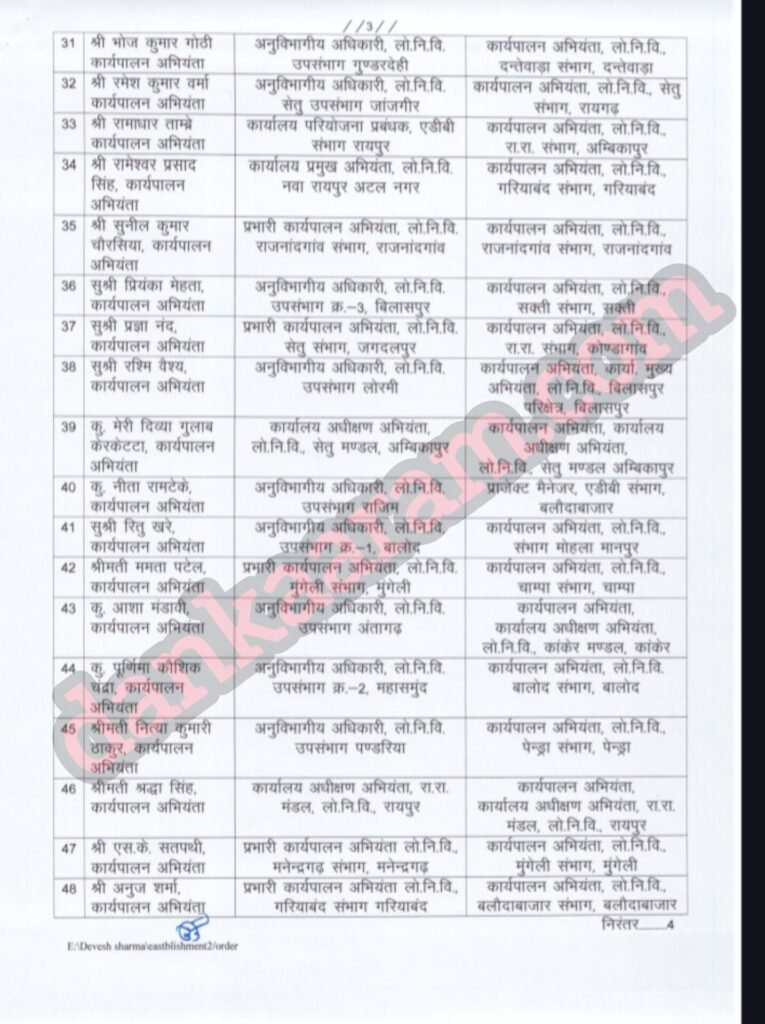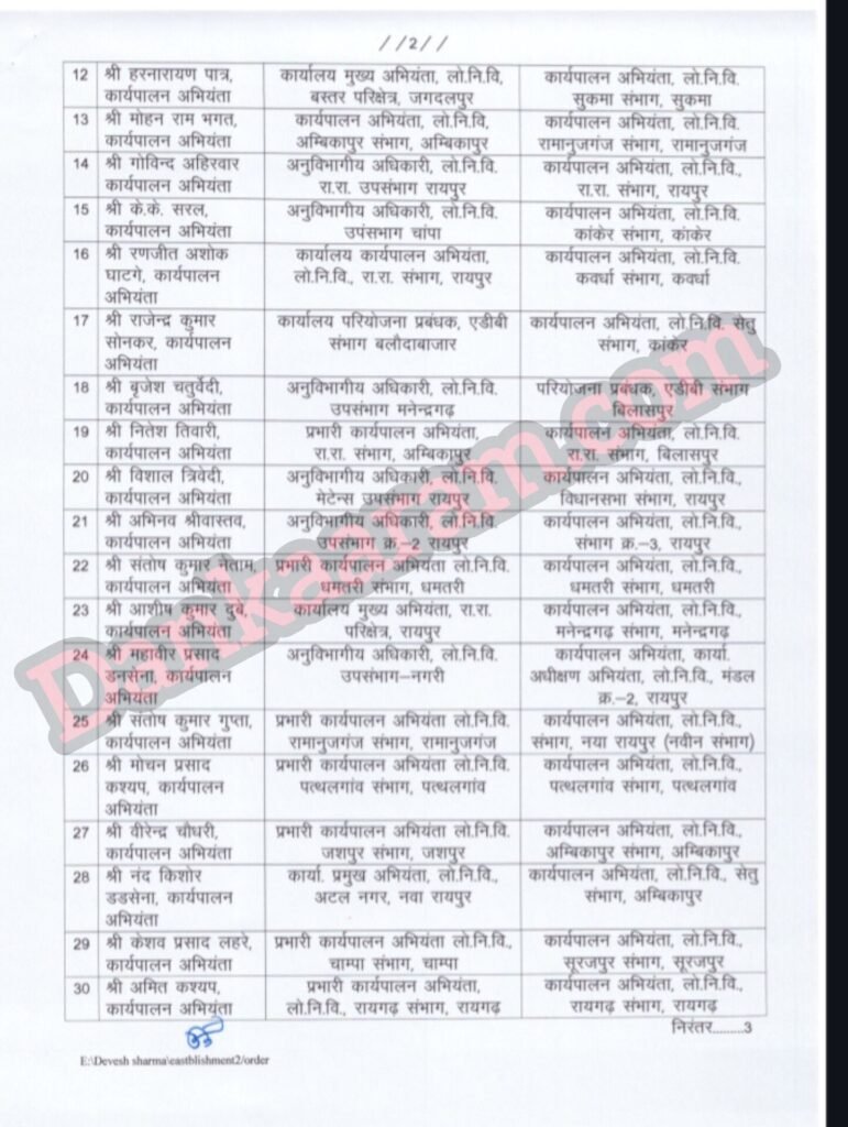 लोक निर्माण विभाग में बड़ी सर्जरी…. 62 ईई और एई को किया गया इधर से उधर….. बड़े पैमाने में तबादला आदेश जारी…. देखिये सूची
