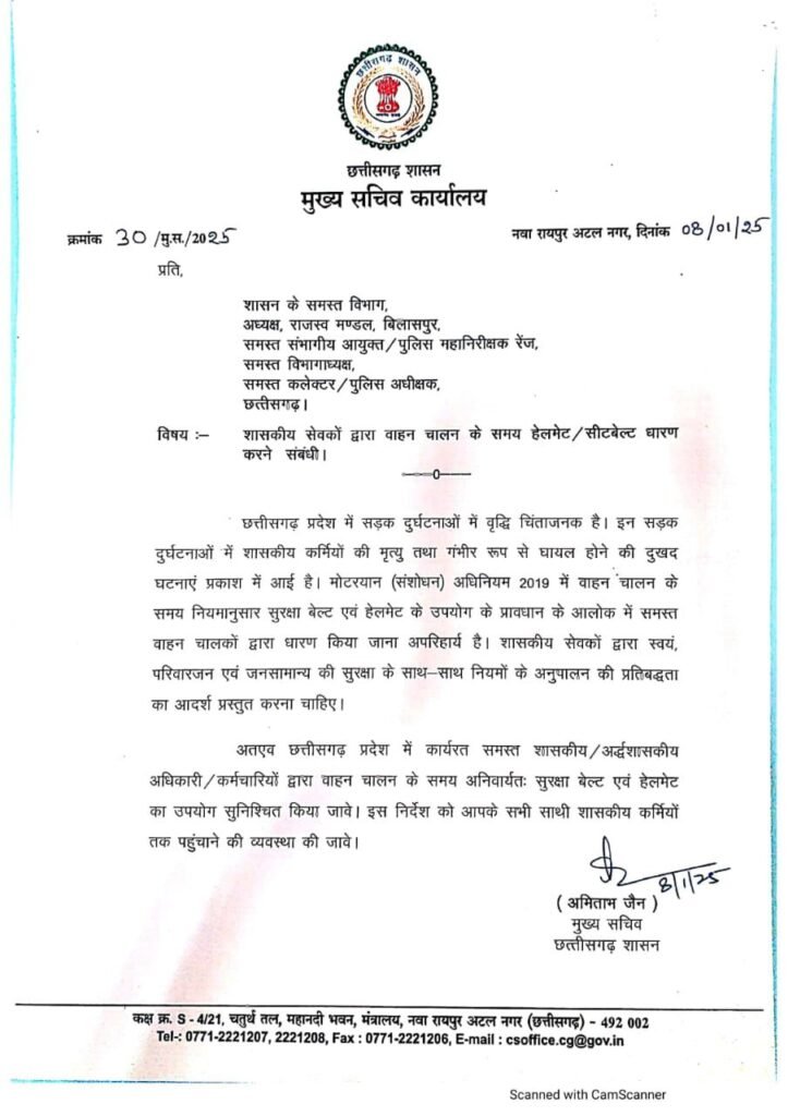 सड़क सुरक्षा: छत्तीसगढ़ में सरकारी कर्मचारियों को हेलमेट और सीट बेल्ट का पालन करने के निर्देश./