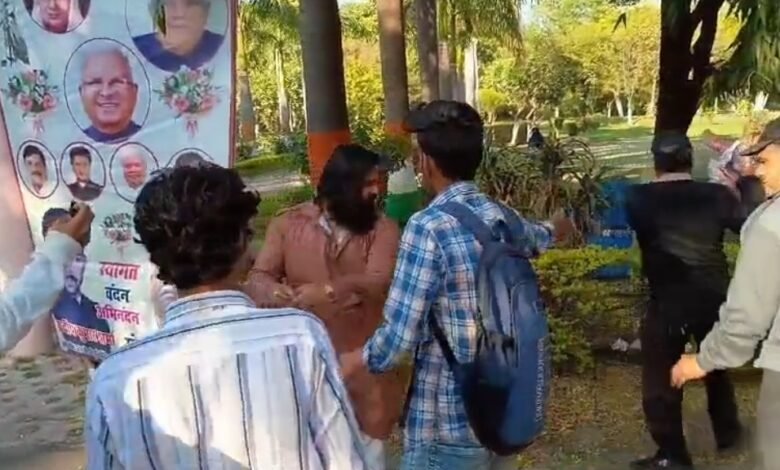 VIDEO – जलाना था कुलसचिव का पुतला, दौड़ा कर NSUI कार्यकर्ताओ ने लगा दी सुरक्षाकर्मी को आग…! NSUI कार्यकर्ताओ की लापरवाही से जिंदा जलने से बाल बाल बचा गार्ड..! । आग की लपटो से घिरे गार्ड ने कपड़े उतार बचाई अपनी जान..!!