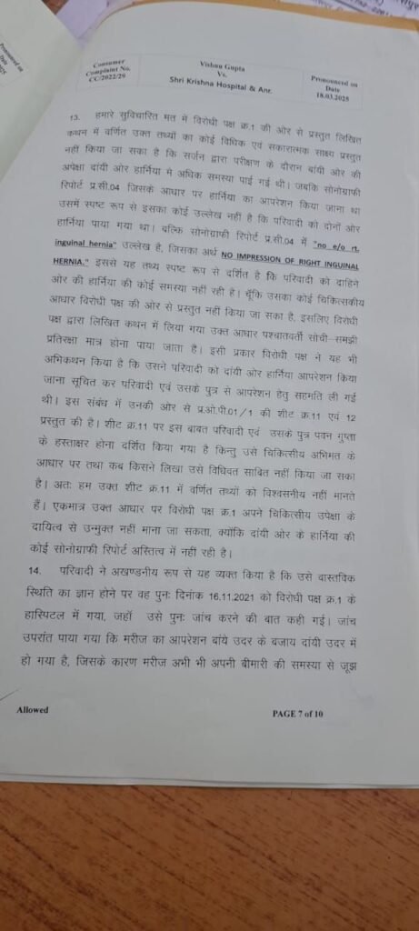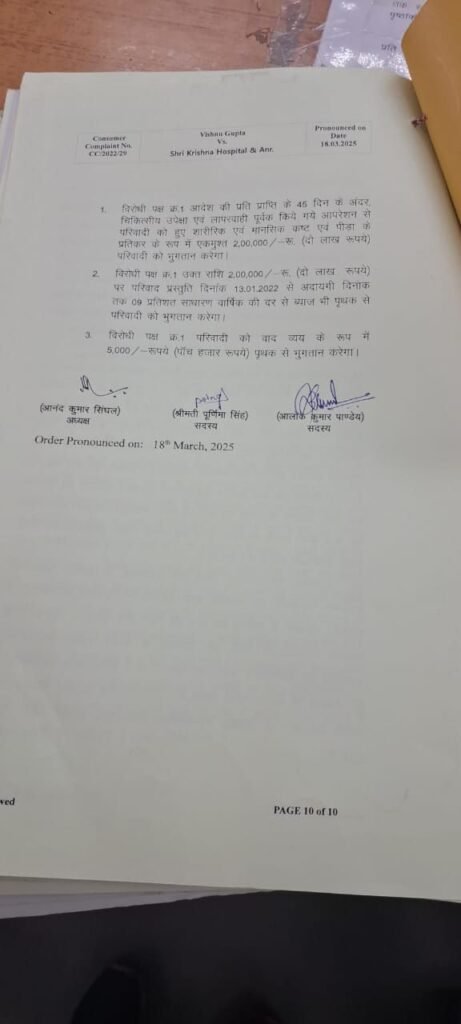 परिवार ने न्याय की गुहार लगाते हुए उपभोक्ता फोरम में शिकायत दर्ज कराई। जांच में स्पष्ट हुआ कि श्री कृष्णा हॉस्पिटल ने घोर लापरवाही की है। मामले की गंभीरता को देखते हुए उपभोक्ता फोरम ने अस्पताल संचालक डॉ. जितेंद्र अग्रवाल पर 2 लाख रुपए का जुर्माना लगाया और पीड़ित परिवार को न्याय दिलाया। आयोग ने सुनवाई के दौरान इसे गंभीर लापरवाही माना, आयोग के अध्यक्ष आनंद सिंघल, सदय पूर्णिमा सिंह और आलोक कुमार पांडे ने डाक्टर के कृत्य को सेवा मे कमी और लापरवाही ठहराते हुए मरीज को हुई शारीरिक और मानसिक पीड़ा के एवज मे 15 दिनों के भीतर जुर्माने सहित 9 प्रतिशत ब्याज और 5 हजार रु वाद व्यय भुगतान करने का आदेश दिया है l