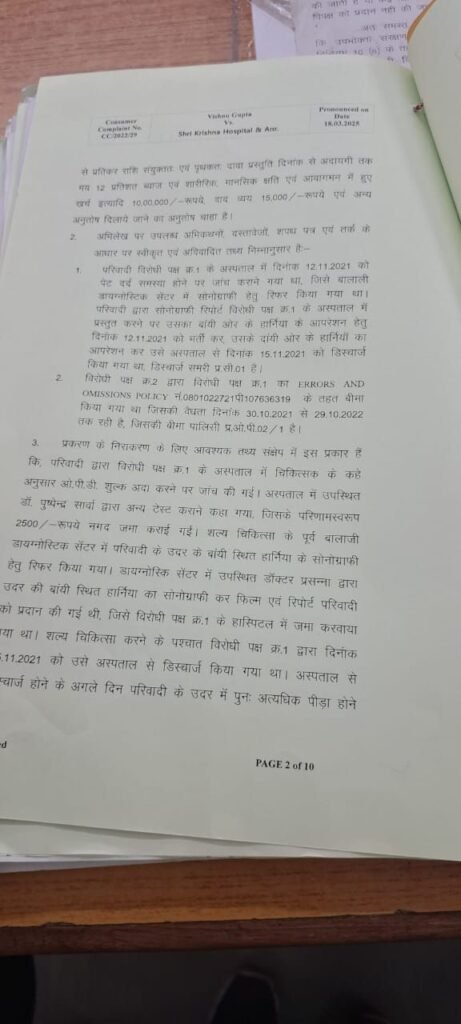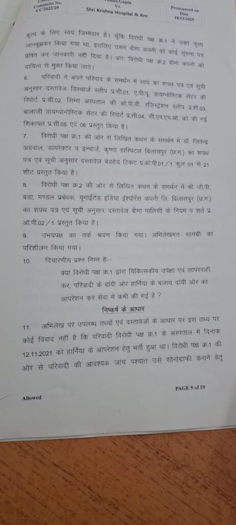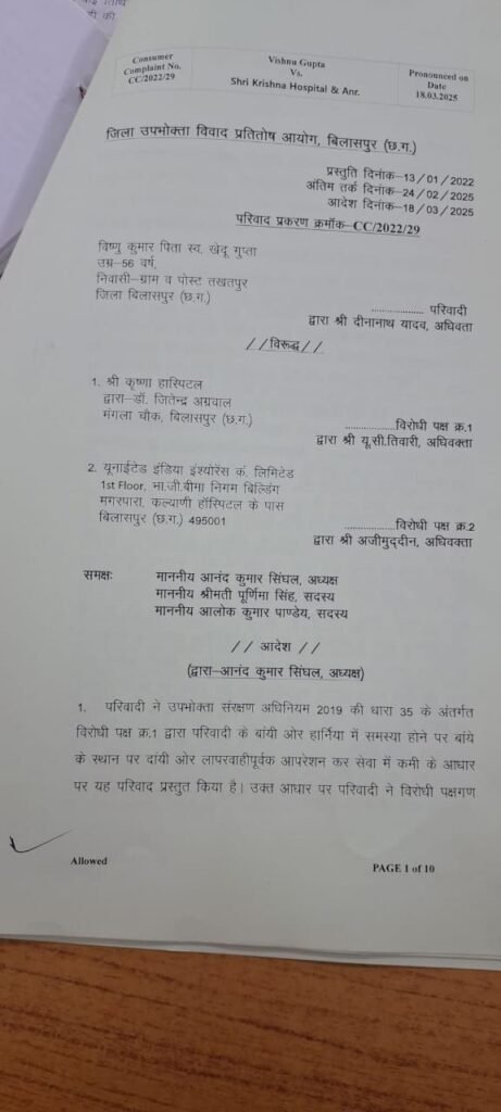 डेस्क खबर बिलासपुर../ छत्तीसगढ़ की न्यायधानी बिलासपुर में निजी अस्पतालों की मनमानी और लचर स्वास्थ्य व्यवस्था का एक और चौंकाने वाला मामला सामने आया है। शहर के मंगला चौक स्थित श्री कृष्णा हॉस्पिटल में डॉक्टरों ने मरीज के गलत हर्निया का ऑपरेशन कर दिया, जिसके बाद उपभोक्ता फोरम ने अस्पताल पर 2 लाख रुपए का जुर्माना लगाया है। और 15 दिवस के अंदर ब्याज सहित 5 हजार रु वाद व्यय हर्जाने के रूप मे भुगतान करने का आदेश जारी किया है l
