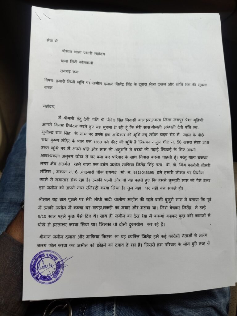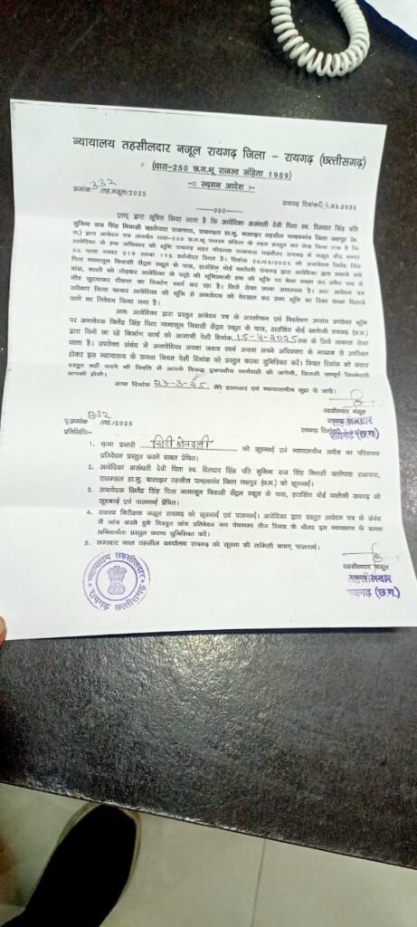 बावजूद इसके जितेंद्र ने अपना अवैध निर्माण बंद नहीं किया। इसके पश्चात उसके द्वारा राजस्व न्यायालय में आवेदन पत्र अंतर्गत – धारा 250.. छ .ग.भू राजस्व संहिता के तहत प्रस्तुत किया गया है। जिसमें पीड़िता ने बताया है कि उसके हक अधिकार की भूमि रायगढ़ शहर मोहल्ला राजापारा गढ़भीतर रायगढ़ में नजूल सीट नम्बर 56 प्लाट नम्बर 219 रकबा 175 वर्गमीटर स्थित है। दिनांक 26/मार्च/2025 को अनावेदक जितेंद्र सिंह पिता नामालूम निवासी सेंट्रल स्कूल के पास हाउसिंग बोर्ड कालोनी रायगढ़ द्वारा आवेदिका द्वारा लगाये बांस बल्ली को तोड़कर आबेदिका के पट्टे की भूमिस्वामी हक की भूमि पर बेजा कब्जा कर अवैध रूप से नींव खोदवाकर दीवाल का निर्माण कार्य कर रहा है। जिसे तुरंत रोका जाना आवश्यक है। पीड़िता/ आवेदिका के आवेदन पत्र पर विचार करने के बाद न्यायालय ने आवेदिका की भूमि से अनावेदक को बेदखल कर उक्त भूमि का रिक्त कब्जा दिलाये जाने का प्रयास शुरू कर दिया है। न्यायालय (धारा-250 छ.ग.भू राजस्व न्यायालय तहसीलदार नजूल रायगढ़ जिला रायगढ़ (छत्तीसगढ़) ने(धारा-250 छ.ग.भू राजस्व संहिता 1959 के तहत पीड़िता के आवेदन पर तत्काल स्थगन आदेश जारी करते हुए।