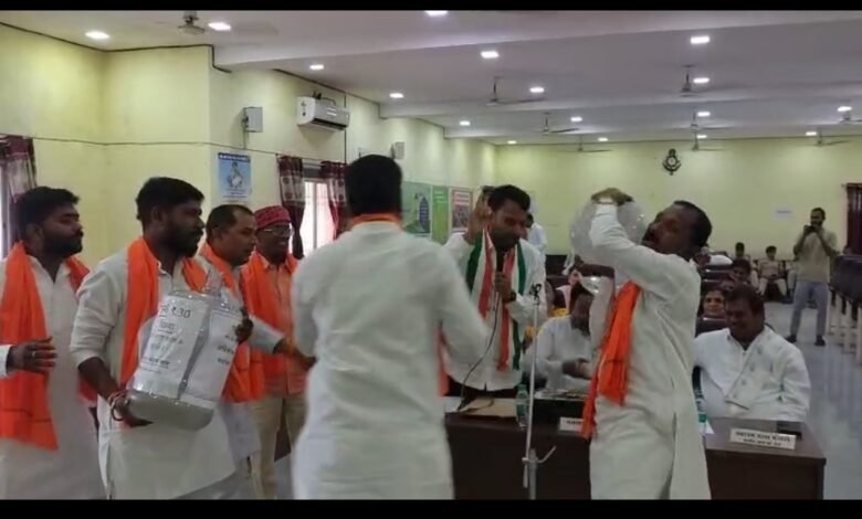 नगर निगम सभा मे जमकर बवाल, बीजेपी पार्षदों ने पानी से भरा कंटेनर मेयर पर डालने का किया प्रयास ।