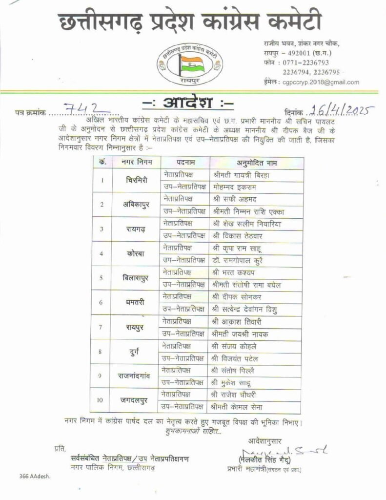 डेस्क खबर कांग्रेस ने जारी की सूची , नगर निगम नेता प्रतिपक्ष और उप नेताप्रतिपक्ष के देखिये नाम डंकारामApril 16, 2025 861 Less than a minute डंकारामApril 16, 2025 861 Less than a minute