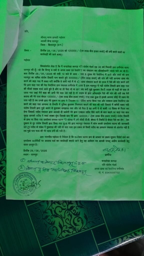 डेस्क खबर ..बिलासपुर की धार्मिक नगरी रतनपुर थाना क्षेत्र के ग्राम रानीगांव में पंचायत सचिव की दबंगई और अवैध वसूली का मामला उजागर हुआ है। आरोप है कि पंचायत सचिव संतोष गंधर्व ने महिला ढाबा संचालक को धमकाकर ₹1,20,000 की मोटी रकम वसूल ली..पीड़ित ने इस पूरे मामले की शिकायत एसएसपी से की, जिसके बाद पुलिस जांच में जुट गई है।