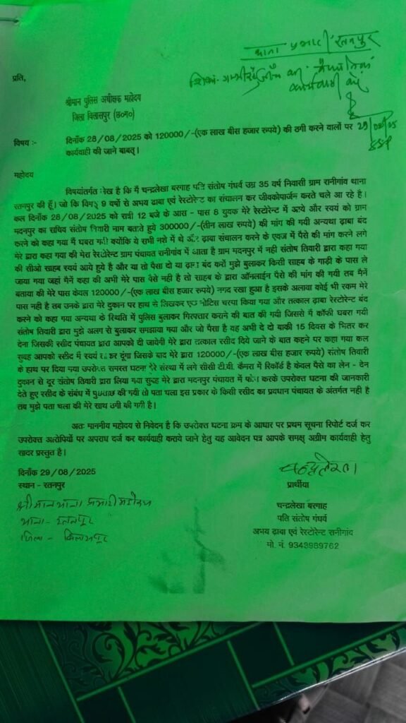 बिलासपुर जिले के रतनपुर थाना क्षेत्र के ग्राम रानीगांव में एक चौंकाने वाला मामला सामने आया है, जहाँ पंचायत सचिव द्वारा एक ढाबा संचालक से कथित रूप से एक लाख बीस हजार रुपए की अवैध वसूली की गई, पीड़ित ने इस संबंध में एसएसपी से शिकायत की है, जिसके बाद पुलिस मामले की जांच कर रही है.. घटना 28 अगस्त की है, जब पंचायत सचिव संतोष गंधर्व अपने कुछ साथियों के साथ रात तकरीबन 120 बजे ढाबा एवं रेस्टोरेंट पर पहुंचा.. आरोप है कि सचिव ने ग्राम मदनपुर का अधिकारी बताकर महिला कर्मचारी की पहचान के बहाने ढाबा बंद कराने की धमकी दी और एक लाख बीस हजार रुपये की मांग की, मजबूर होकर ढाबा संचालक ने रकम दे दी..
