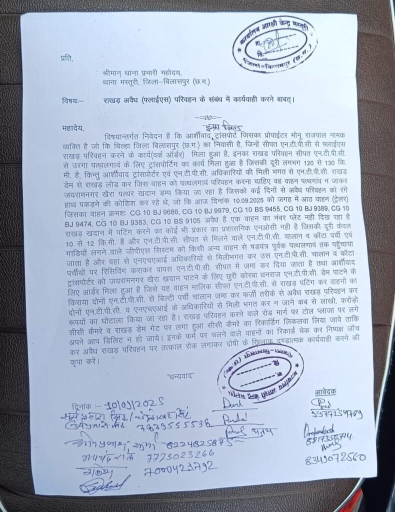 स्थानीय लोगों ने आरोप लगाया कि यह खेल लंबे समय से चल रहा है और अब तक लाखों-करोड़ों रुपये का गबन हो चुका है। इस मामले में मस्तूरी थाने में शिकायत की गई है और पुलिस ने कार्रवाई का आश्वासन दिया है। क्षेत्रवासियों की मांग है कि परिवहन मार्ग और एनटीपीसी राखड़ डेम गेट पर लगे सीसीटीवी फुटेज को सुरक्षित किया जाए, ताकि सबूत मिटाए न जा सकें। साथ ही, निष्पक्ष जांच कर दोषियों पर कड़ी कार्रवाई की जाए। यह मामला न केवल बड़े पैमाने पर भ्रष्टाचार को उजागर करता है बल्कि पर्यावरण और प्रशासनिक पारदर्शिता पर भी गंभीर सवाल खड़े करता है।