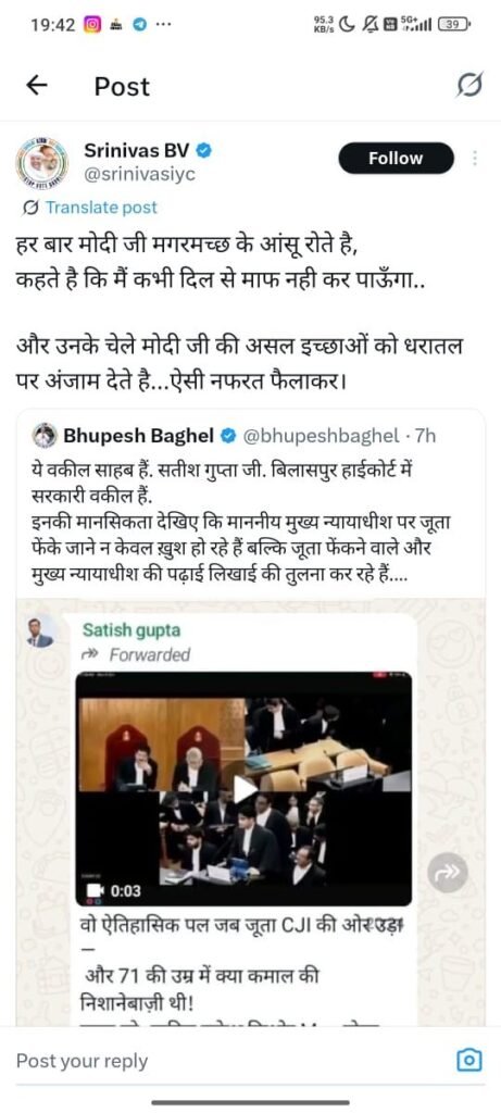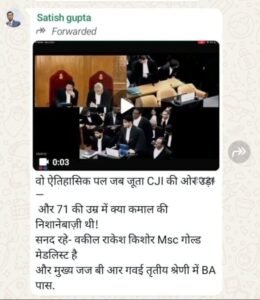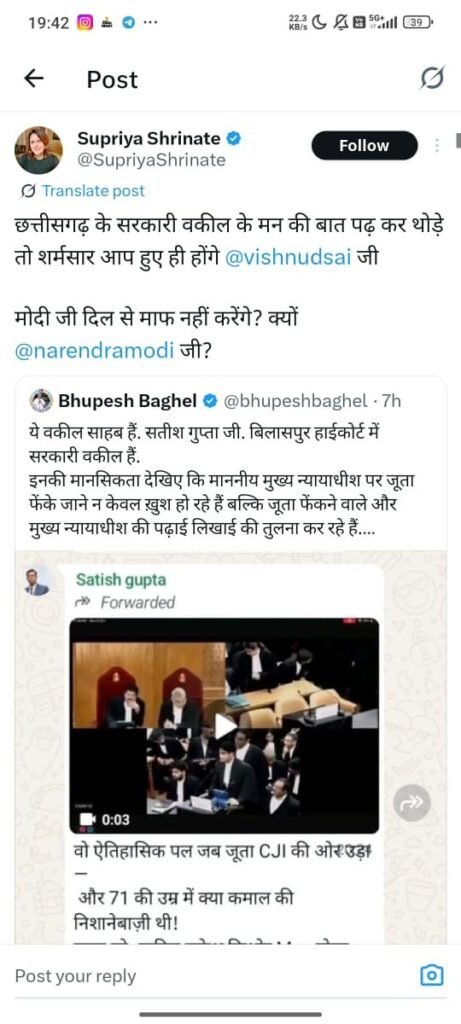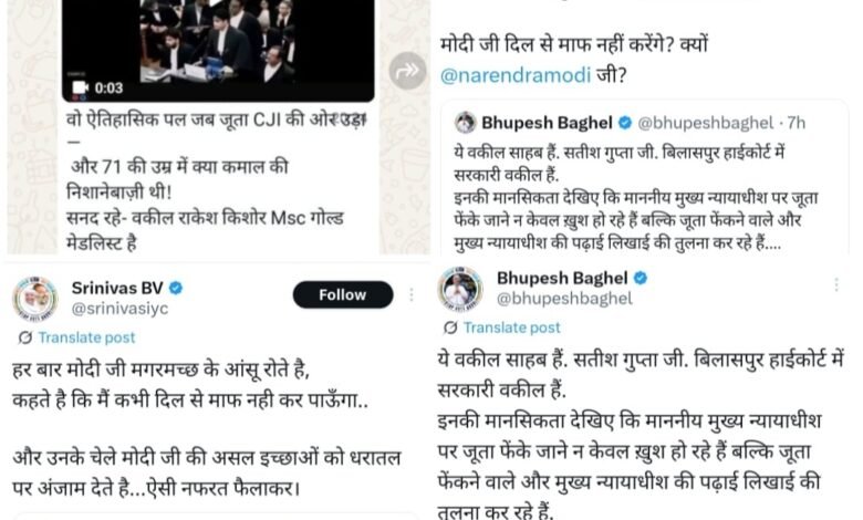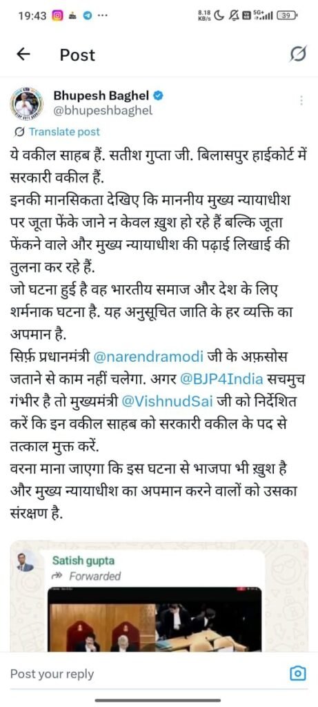 डेस्क खबर बिलासपुर../ देश के चीफ जस्टिस ऑफ इंडिया (CJI) के ऊपर जूता फेंकने की घटना को लेकर छत्तीसगढ़ हाईकोर्ट के सरकारी वकील सतीश गुप्ता की सोशल मीडिया पर की गई टिप्पणी अब विवादों में घिर गई है। यह पोस्ट तेजी से वायरल हो रही है और राजनीतिक गलियारों में हलचल मचा दी है। जूता फेंकने की इस घटना पर सरकारी वकील द्वारा सोशल मीडिया पर किए गए पोस्ट को आधार बनाकर कांग्रेस ने एकजुट होकर सतीश गुप्ता के खिलाफ हल्लाबोल दिया है ।