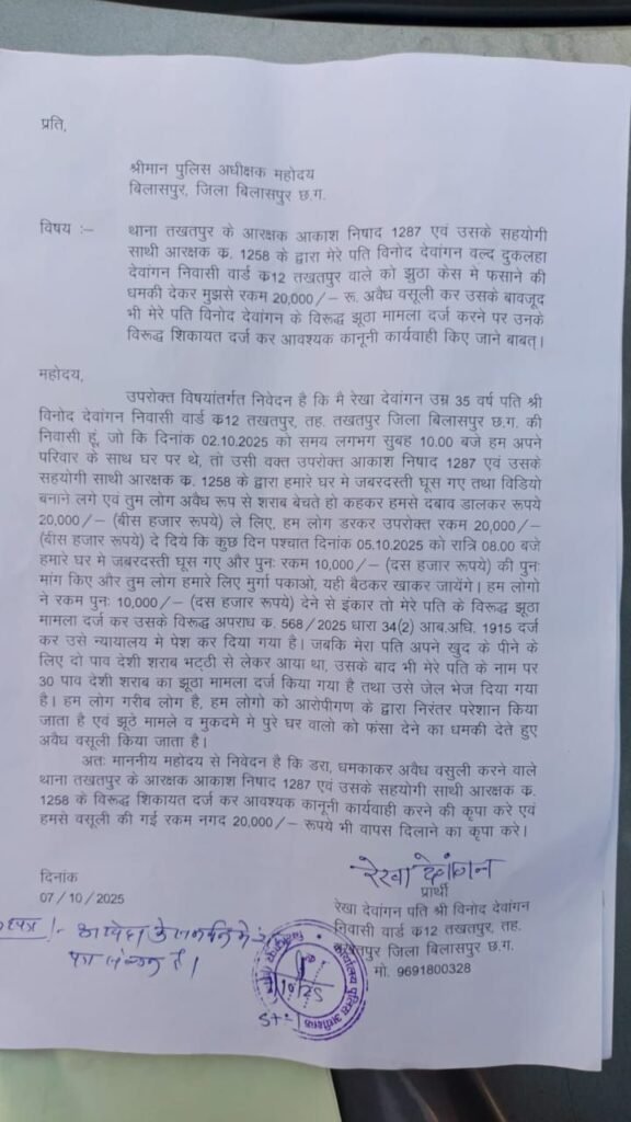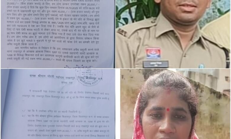 डेस्क खबर बिलासपुर ../ प्रदेश की न्यायधानी बिलासपुर जिले के l अलग अलग थाने से लगातार शराब के मामले में झूठा फंसाने की शिकायतें सामने आ रही है । अभी सीपत का मामला ठंडा भी नहीं हुआ था कि तखतपुर थाने में पदस्थ आरक्षक आकाश निषाद (क्रमांक 1287) पर वार्ड क्रमांक 12 की एक महिला ने गंभीर आरोप लगाए हैं। महिला का कहना है कि आरक्षक ने जबरन घर में घुसकर अवैध वसूली की और पैसे न देने पर उसके पति को झूठे शराब तस्करी के केस में फंसा दिया। महिला ने इस संबंध में पुलिस अधीक्षक को लिखित शिकायत दी है और शपथ पत्र भी सौंपा है। शिकायत में बताया गया कि आरक्षक ने पहले 20 हजार रुपए लिए और फिर 10 हजार की दोबारा मांग की। इंकार करने पर अगले दिन उसके पति को शराब लाने के आरोप में गिरफ्तार कर जेल भेज दिया गया। महिला ने सवाल उठाया कि बिना महिला पुलिस और अनुमति के घर में घुसना नियमों की धज्जियां उड़ाना है। आरक्षक आकाश निषाद का पहले भी विवादित इतिहास रहा है। अवैध वसूली को लेकर ग्रामीणों से मारपीट तक हो चुकी है। मामले की गंभीरता को देखते हुए बिलासपुर एसएसपी ने तत्काल आरक्षक को निलंबित कर दिया है।