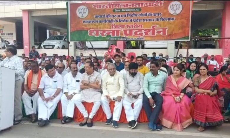 बिलासपुर।कवर्धा की घटना और निर्दोष लोगों के ऊपर एकतरफा कार्रवाई के विरोध में भारतीय जनता पार्टी ने आज राज्य सरकार के खिलाफ हल्ला बोला।आज विरोध में जिला स्तरीय धरना प्रदर्शन किया गया। बिलासपुर में नेहरू चौक के पास भाजपाई धरना पर बैठे, जिसमें नेता प्रतिपक्ष धरमलाल कौशिक, सांसद, विधायक सहित जिले के अन्य भाजपाई शामिल हुए।