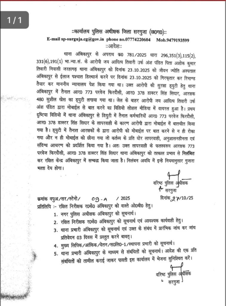 वीडियो वायरल होने के बाद पुलिस विभाग में हड़कंप मच गया। जांच के दौरान पाया गया कि जेल के अंदर मोबाइल की सुविधा पुलिस कर्मियों की लापरवाही और मिलीभगत से संभव हुई थी। इस गंभीर लापरवाही को देखते हुए आईजी के निर्देश पर वरिष्ठ पुलिस अधीक्षक राजेश अग्रवाल ने तत्काल कार्रवाई करते हुए आरक्षक सुशील खेस, परवेज फिरदौसी और डॉ. सीम सिद्दार को निलंबित कर दिया। इस मामले में जांच के आदेश भी जारी कर दिए गए है ।