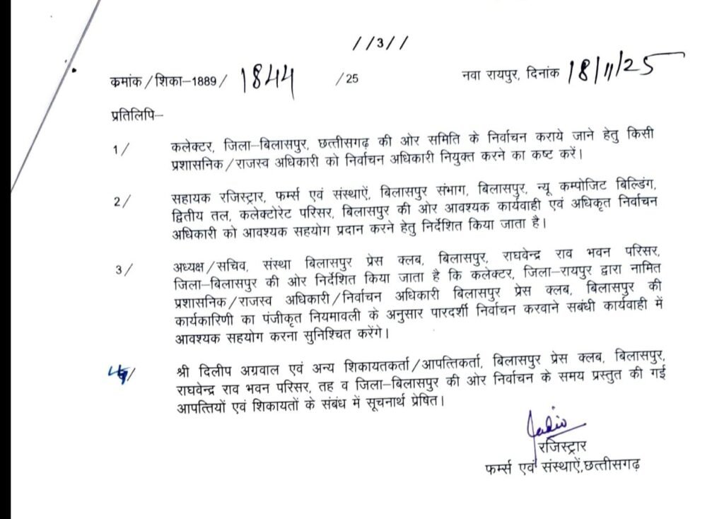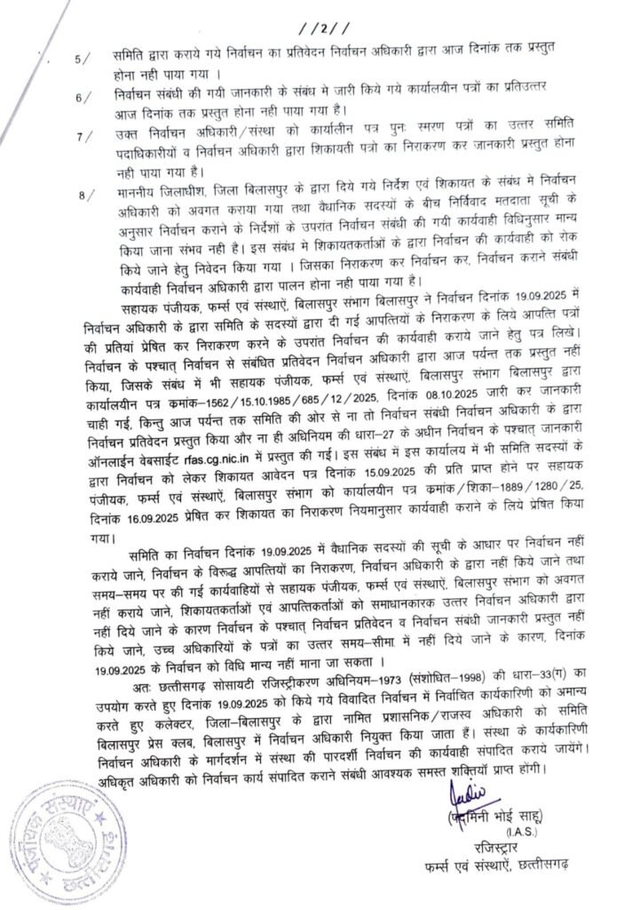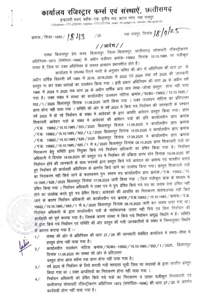डेस्क खबर बिलासपुर ../ बिलासपुर प्रेस क्लब के बहुचर्चित और विवादों से घिरे चुनाव को लेकर बड़ा कदम उठाते हुए रजिस्ट्रार, फर्म्स एंड सोसाइटीज़ विभाग ने वर्ष 2024-25 के लिए प्रस्तावित पूरे चुनाव को निरस्त कर दिया है। 18 नवंबर 2025 को जारी आदेश में रजिस्ट्रार ने स्पष्ट लिखा कि चुनाव प्रक्रिया में आवश्यक नियमों का पालन नहीं किया गया, निर्वाचन अधिकारी द्वारा मांगे गए दस्तावेज प्रस्तुत नहीं किए गए और तय समयसीमा की लगातार अनदेखी की गई। इसी के चलते पूरी चुनाव प्रक्रिया को असंवैधानिक मानते हुए अमान्य घोषित कर दिया गया।