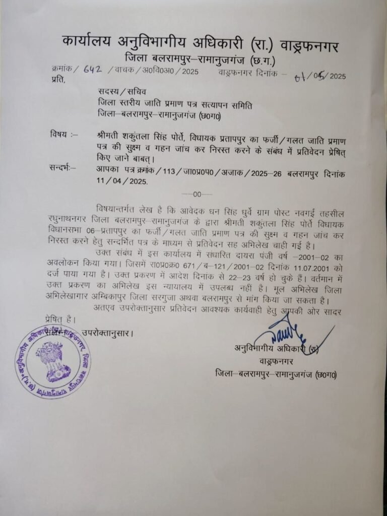 विधायक शकुंतला सिंह पोर्ते के जाति विवाद में नया मोड़,SDM द्वारा जारी दस्तावेज़ों ने बढ़ाई हलचल।