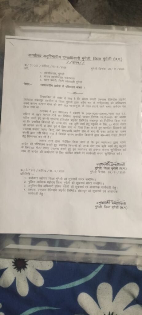 लगातार समस्या बढ़ने पर किसानों ने कई बार राजस्व विभाग से इसकी शिकायत की। कृषि कार्य प्रभावित होने पर मामले को गंभीरता से लेते हुए अनुविभागीय दंडाधिकारी (SDM), मुंगेली द्वारा स्पष्ट आदेश जारी किया गया है कि प्रभावित किसानों को 3 मीटर मार्ग उपलब्ध कराया जाए। इसके साथ ही तहसीलदार, नायब तहसीलदार और टीआई कोतवाली मुंगेली को निर्देशित किया गया है कि मार्ग बहाल करने की कार्रवाई सुनिश्चित की जाए और इसकी रिपोर्ट कार्यालय को भेजी जाए। आदेश में यह भी उल्लेख है कि निर्देश की अवहेलना होने पर संबंधित कंपनी के खिलाफ कड़ी कार्रवाई की जाए।