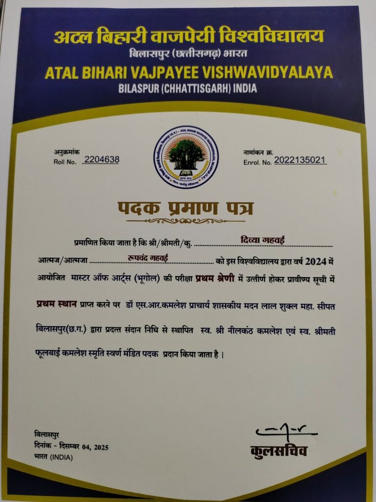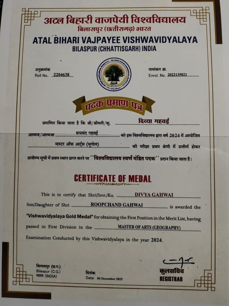 डेस्क खबर बिलासपुर../ शासकीय जमुना प्रसाद वर्मा स्नातकोत्तर कला एवं वाणिज्य महाविद्यालय की छात्रा कु. दिव्या गहवई ने अटल बिहारी वाजपेई विश्वविद्यालय, बिलासपुर के छठवें दीक्षांत समारोह में भूगोल विषय में स्वर्ण पदक प्राप्त कर महाविद्यालय और अपने परिजनों का मान बढ़ाया है।