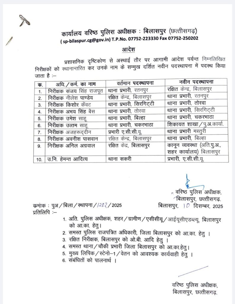 डेस्क खबरबिलासपुर बिलासपुर थाना स्तर पर सर्जरी, कई थानों के थाना प्रभारी हुए इधर उधर .देखिए पूरी लिस्ट ! डंकारामDecember 10, 2025 870 Less than a minute डंकारामDecember 10, 2025 870 Less than a minute