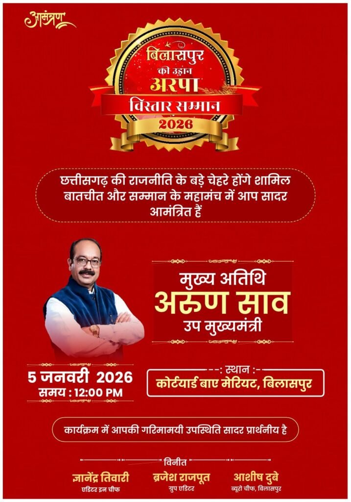डेस्क खबर बिलासपुर../ बिलासपुर के कोर्टयार्ड बाय मैरियट होटल में देश के प्रतिष्ठित चैनल विस्तार न्यूज़ का बड़ा आयोजन होने जा रहा है। इस कार्यक्रम में विस्तार न्यूज़ के एडिटर इन चीफ और देश के नामी पत्रकार ज्ञानेंद्र तिवारी और ग्रुप एडिटर बृजेश राजपूत मौजूद रहेंगे। कार्यक्रम में मुख्य अतिथि के तौर पर छत्तीसगढ़ के उपमुख्यमंत्री अरुण साव होंगे। इस आयोजन में कई बड़ी हस्तियों का सम्मान होगा वही बिलासपुर के विकास की बात होगी। पिछले 16 महीने में टीवी चैनलों में एक अलग नाम बन चुके विस्तार न्यूज़ के इस आयोजन की चर्चा पूरे बिलासपुर में है। कार्यक्रम की रूपरेखा और बिलासपुर में आयोजन की समस्त जिम्मेदारी बिलासपुर के विस्तार न्यूज के ब्यूरो चीफ आशीष दुबे संभाल रहे हैं जो पिछले 16 सालों से कई प्रतिष्ठित अखबार और चैनल में काम कर चुके हैं। इस आयोजन में प्रेस क्लब के अध्यक्ष अजीत मिश्रा जी की टीम और दिलीप अग्रवाल सहित उनकी टीम भी सम्मानित होगी।