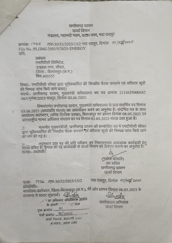 डेस्क खबर बिलासपुर ./ एनटीपीसी सीपत, बिलासपुर में भू-विस्थापितों की वरीयता सूची को लेकर बड़े स्तर पर फर्जीवाड़ा, भ्रष्टाचार और प्रशासनिक लापरवाही के गंभीर आरोप सामने आए हैं। अंतरराष्ट्रीय मानवाधिकार संगठन छत्तीसगढ़ ने इस मामले को लेकर कलेक्टर और मुख्यमंत्री को आवेदन देकर निष्पक्ष जांच की मांग की है। संगठन का आरोप है कि एनटीपीसी सीपत द्वारा तैयार की गई वरीयता सूची में भारी अनियमितताएं की गई हैं, जिसके कारण योग्य भू-विस्थापितों को नौकरी से वंचित किया गया है, जबकि अयोग्य व्यक्ति वर्षों से नौकरी कर रहे हैं।