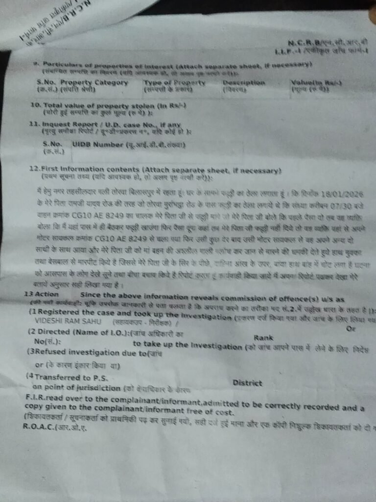 प्राप्त जानकारी के अनुसार, पीड़ित परिवार तोरवा के मुर्राभट्ठा रोड के पास फल्ली ठेला लगाकर रोज़ी-रोटी का साधन चलाता है। दिनांक 18 जनवरी 2026 की शाम लगभग 7:30 बजे वाहन क्रमांक CG10 AE 8249 का चालक फल्ली ठेले पर पहुंचा और फल्ली मांगी। जब पीड़ित ने पहले पैसे देने की बात कही, तो आरोपी नाराज हो गया और विवाद करते हुए वहां से चला गया।