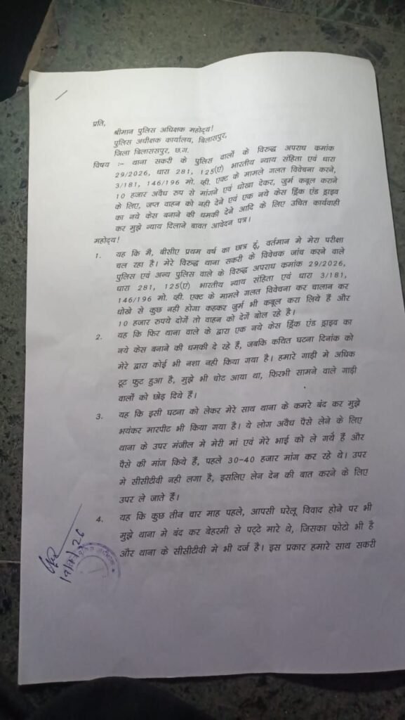 डेस्क खबर बिलासपुर ../ बिलासपुर जिले के सकरी थाना क्षेत्र से जुड़ा एक वीडियो सोशल मीडिया पर तेजी से वायरल हो रहा है, जिसने पुलिस महकमे को कटघरे में खड़ा कर दिया है। वायरल वीडियो में एक पुलिस आरक्षक कथित तौर पर ड्रिंक एंड ड्राइव मामले को खत्म करने के नाम पर पीड़ित से अवैध रूप से पैसे की मांग करता हुआ नजर आ रहा है। लगातार पुलिस विभाग से जुड़े अधिकारियों और जवानों के वायरल हो रहे वीडियो से पुलिस विभाग की किरकिरी हो रही है । इस वीडियो सामने आते ही पुलिस विभाग में हड़कंप मच गया है और पूरे मामले को लेकर चर्चाओं का दौर तेज हो गया है।
