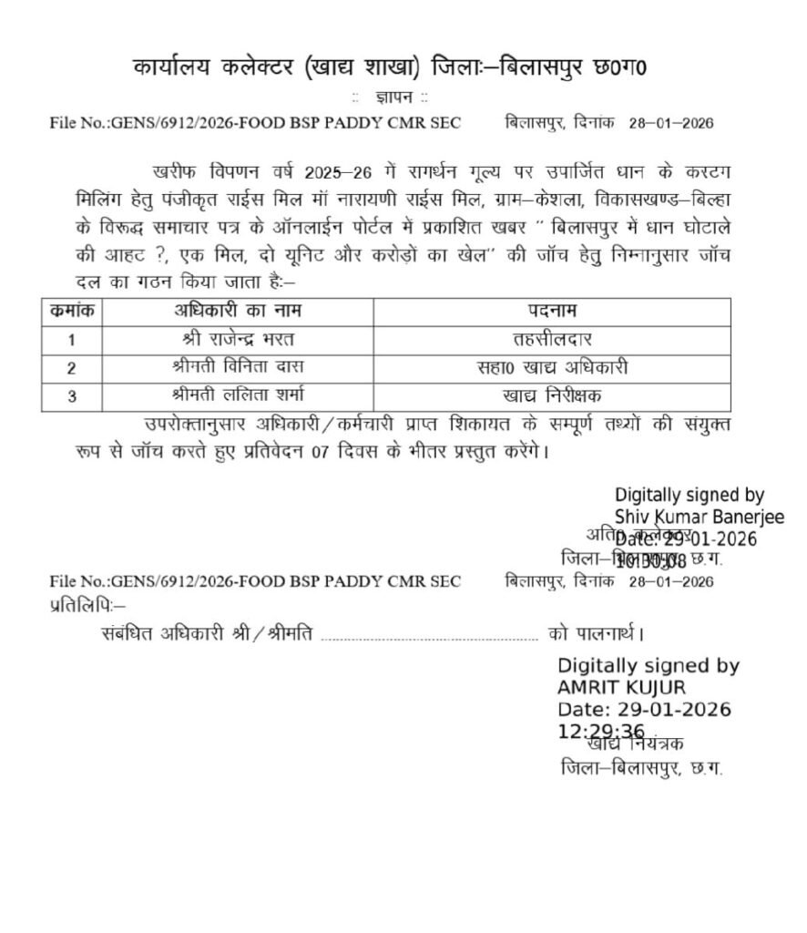 मीडिया में मामला उजागर होने के बाद कलेक्टर ने संज्ञान लेते हुए खाद्य नियंत्रक अमृत कुजूर को जांच के निर्देश दिए हैं। इसके बाद तहसीलदार राजेंद्र भगत, सहायक खाद्य अधिकारी विनीता दास और खाद्य निरीक्षक ललिता शर्मा की संयुक्त जांच टीम गठित की गई है।
