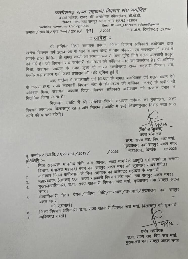 मीडिया की बयान देना विपणन अधिकारी को पड़ा भारी ! 7 करोड़ धान घोटाले मामले में डीएमओ अभिषेक मिश्रा निलंबित.! बयान जमकर हो रहा सोशल मीडिया में वायरल .!!