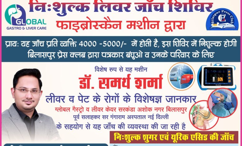 शिविर में महानगरों में हजारों रुपये खर्च कर कराई जाने वाली फाइब्रोस्कैन जांच पूरी तरह नि:शुल्क की जाएगी। आयोजकों के अनुसार यह विशेष मशीन बिलासपुर प्रेस क्लब की नवनियुक्त कार्यकारिणी के प्रयासों से मंगवाई गई है, ताकि पत्रकार साथियों, उनके परिजनों और शहर के सभी नागरिकों को इसका लाभ मिल सके। इस मशीन के माध्यम से लीवर की वर्तमान स्थिति का सटीक आकलन किया जा सकेगा।चिकित्सकों ने जांच के लिए इच्छुक लोगों से अपील की है कि वे खाली पेट आएं या जांच से कम से कम तीन घंटे पहले तक कुछ न खाएं। शिविर में मध्य भारत के प्रसिद्ध लीवर एवं पेट रोग विशेषज्ञ डॉ. समर्थ शर्मा (ग्लोबल गैस्ट्रो व लीवर केयर, अशोक नगर सरकंडा, पूर्व सलाहकार सर गंगाराम हॉस्पिटल नई दिल्ली) भी उपस्थित रहेंगे। उनसे मुलाकात और परामर्श भी नि:शुल्क रहेगा।
