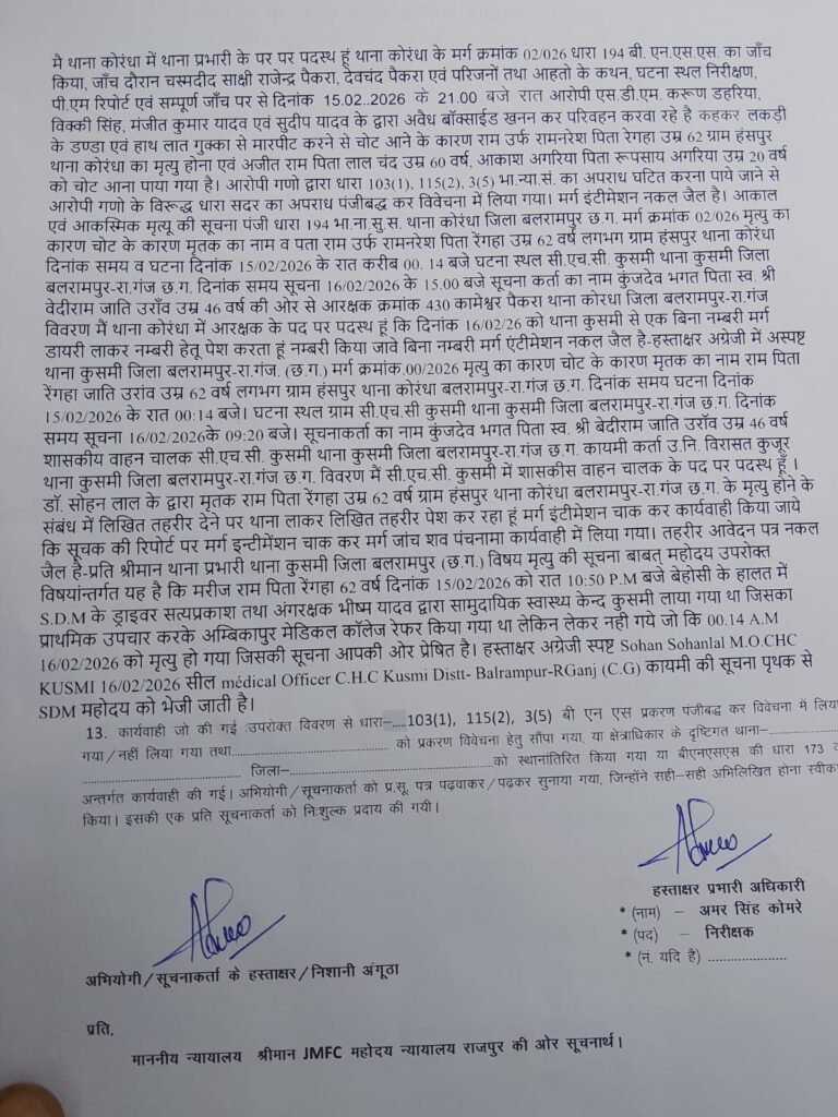 जानकारी के अनुसार अवैध खनन की शिकायत पर एसडीएम करुण डहरिया अपनी टीम के कुछ गुर्गे के साथ मौके पर पहुंचे थे। इसी दौरान विवाद की स्थिति बनी और कथित मारपीट की घटना सामने आई। घटना में दो अन्य लोग घायल हुए हैं, जिनका इलाज कुसमी में जारी है। ग्रामीण की मौत के बाद समाज में आक्रोश और बढ़ गया। इस मामले में कांग्रेस ने भी आदिवासी ग्रामीण की मौत के बाद बीजेपी सरकार को आड़े हाथों लेते हुए इस मौत को प्रशासनिक आतंकवाद की संज्ञा दी थी ।