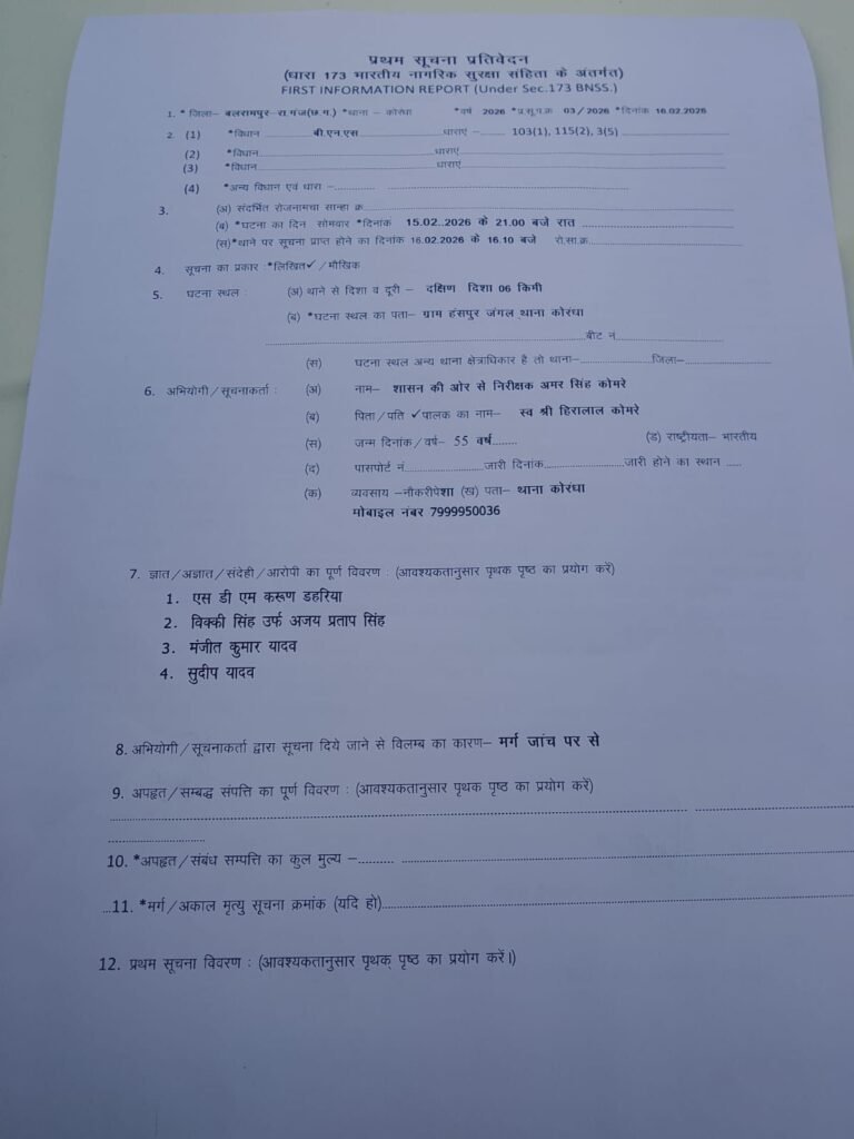 इस मामले में कोरौंधा पुलिस ने एसडीएम करुण डहरिया सहित चार लोगों के खिलाफ एफआईआर दर्ज कर जांच शुरू कर दी है जबकि न्यायलय के आदेश के सभी आरोपियों को जेल भेज दिया गया है गौरतलब है कि करुण डहरिया का पूर्व कार्यालय भी विवादों से घिरा हुआ है । जांजगीर में एक छात्र की पिटाई और नलकूप खनन मामले में 20 हजार रु की रिश्वत लेने में एसीबी द्वारा उनकी गिरफ्तारी चर्चा का विषय बनी थी ।