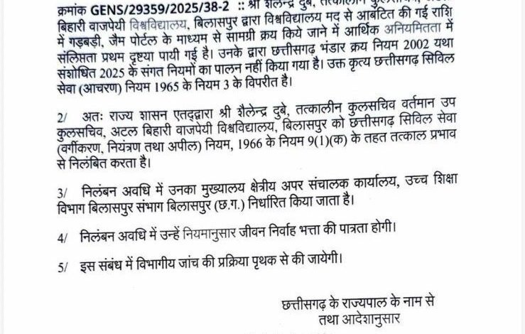 डेस्क खबर बिलासपुर./अटल बिहारी वाजपेयी विश्वविद्यालय बिलासपुर में आर्थिक अनियमितता के मामले में बड़ी कार्रवाई करते हुए तत्कालीन कुलसचिव एवं वर्तमान उप कुलसचिव शैलेंद्र दुबे को निलंबित कर दिया गया है। इसका आदेश उच्च शिक्षा विभाग, मंत्रालय ने जारी किया है।