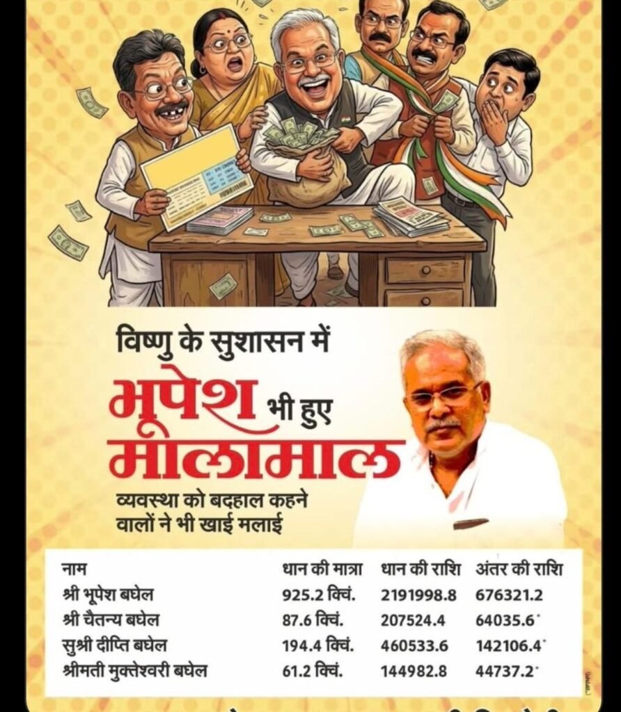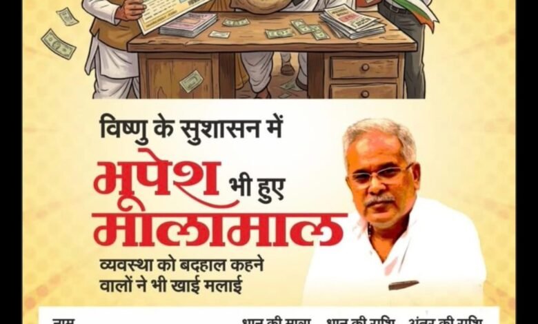 डेस्क खबर ../ छत्तीसगढ़ में धान खरीदी और भुगतान को लेकर राजनीतिक बयानबाजी तेज हो गई है। पूर्व सीएम भूपेश बघेल के नाम पर बीजेपी ने एक पोस्टर जारी करते विष्णु देव सरकार में उन्हें मालामाल किसान बताया था ।बीजेपी के इस पोस्ट र जारी होने के बाद कांग्रेस भी फ्रंटफुट पर आ गई सबसे पहले भूपेश बघेल ने ट्वीट के जरिए बीजेपी को घेरा भूपेश ने अपने आप को किसान बताते हुए बीजेपी के तीखा कटाक्ष किया है ।