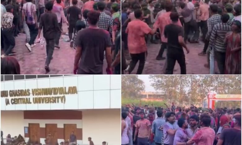 डेस्क खबर बिलासपुर ../ बिलासपुर स्थित गुरु घासीदास विश्वविद्यालय में एक बार फिर छात्रों के बीच विवाद का और मारपीट का वीडियो वायरल हो रहा है । दावा किया जा रहा है होली मिलन समारोह के दौरान छात्रों के बीच जमकर मारपीट हो गई। जानकारी के अनुसार ब्रदरहुड संघ के छात्रों द्वारा केंद्रीय विश्वविद्यालय परिसर में होली मिलन समारोह का आयोजन किया गया था। कार्यक्रम के दौरान रंग लगाने को लेकर शुरू हुआ विवाद देखते ही देखते उग्र हो गया और जमकर मारपीट शुरू हो गई जिसके कारण होली का उत्सव तनावपूर्ण बन गया प्रत्यक्षदर्शियों के मुताबिक कुछ छात्र एक-दूसरे पर लात-घूंसे सहित एक दूसरे पर बेल्ट तक चलाते नजर आए। विश्वविद्यालय परिसर में ही हुए इस घटनाक्रम का वीडियो भी सामने आया है, जिसमें कथित रूप से अनुशासित माने जाने वाले छात्र आपस में भिड़ते दिख रहे हैं। घटना के बाद कैंपस में अफरा-तफरी का माहौल बन गया।