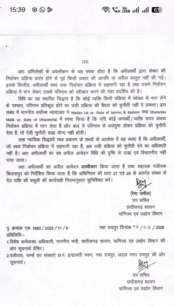 आदेश में यह भी उल्लेख किया गया कि यदि अपीलकर्ता दिलीप यादव को चुनाव प्रक्रिया पर आपत्ति थी तो उसे चुनाव प्रक्रिया प्रारंभ होने से पहले अपील करनी चाहिए थी। चूंकि अपीलकर्ता दिलीप यादव स्वयं चुनाव में शामिल हुआ और बाद में परिणाम को चुनौती दी, इसलिए यह विधि के स्थापित सिद्धांतों के विपरीत है। सुप्रीम कोर्ट के फैसलों का हवाला देते हुए कहा गया कि कोई भी व्यक्ति किसी प्रक्रिया में स्वेच्छा से भाग लेने के बाद उसके परिणाम के विरुद्ध उसी प्रक्रिया की वैधता को चुनौती नहीं दे सकता। इन सभी तथ्यों को ध्यान में रखते हुए शासन ने अपील को अस्वीकार कर दिया है और सहायक पंजीयक बिलासपुर को निर्देश दिया है कि अधिनियम की धारा 27 व 28 के अंतर्गत संस्था से नियमानुसार कार्रवाई सुनिश्चित की जाए।