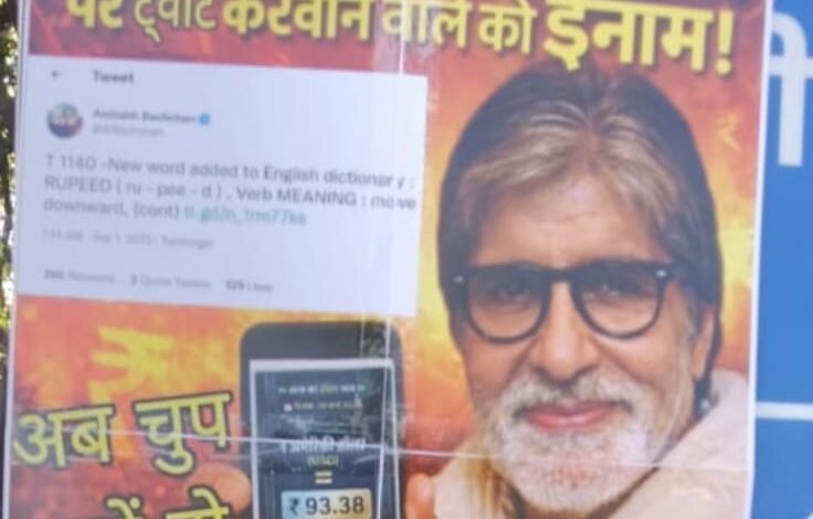 डेस्क खबर ../ देश में डॉलर के मुकाबले गिरते रुपये को लेकर सियासत तेज हो गई है। कांग्रेस ने इस मुद्दे पर बॉलीवुड के महानायक अमिताभ बच्चन के एक ट्वीट पर 51 हजार इनाम की घोषणा करते हुए पोस्टर भी जारी कर दिए है , इन पोस्टरों के उन्हें “शहंशाह” कहकर संबोधित करते हुए उनकी चुप्पी पर सवाल उठाए गए हैं। कांग्रेस का कहना है कि जब 2013 में रुपये की गिरावट पर अमिताभ बच्चन ने ट्वीट कर चिंता जताई थी, तो अब डॉलर के मुकाबले रुपये के 93 के पार जाने पर वे खामोश क्यों हैं। पोस्टरवार के जरिए अमिताभ बच्चन के माध्यम से केंद्र सरकार को निशाने में लेने वाले इस अभियान की शुरुआत मध्यप्रदेश के इंदौर शहर के कांग्रेसी नेताओं ने की है । पोस्टर में 2013 का पुराना ट्वीट भी दिखाया गया है, जिसमें बच्चन ने रुपये की कमजोरी पर प्रतिक्रिया दी थी। कांग्रेस ने सवाल उठाया कि क्या अब हालात ज्यादा गंभीर नहीं हैं, फिर भी सेलिब्रिटीज की चुप्पी क्यों बनी हुई है।