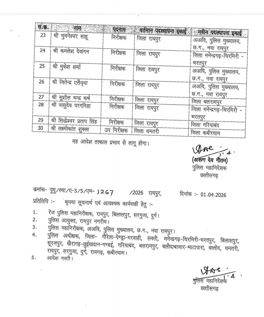 छत्तीसगढ़डेस्क खबर छत्तीसगढ़ में पुलिस विभाग में बड़ा फेरबदल ,पुलिस मुख्यालय ने 30 पुलिसकर्मियों का किया ट्रांसफर ।29 निरीक्षक और 1 उप निरीक्षक फेरबदल किया गया ! पुलिस मुख्यालय ने जारी किया आदेश। देखिए लिस्ट डंकारामApril 1, 2026 501 Less than a minute डंकारामApril 1, 2026 501 Less than a minute