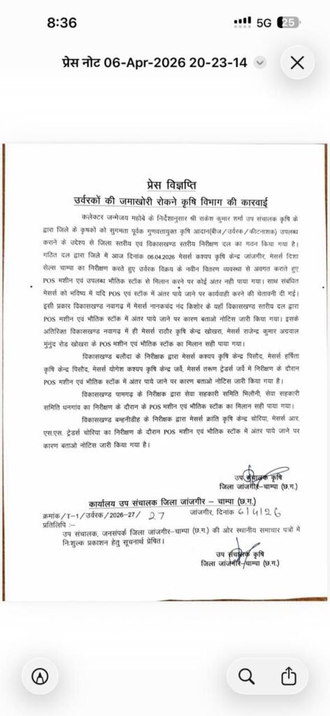 वहीं नवागढ़ विकासखंड में मेसर्स नानकचंद नंद किशोर के यहां पीओएस और स्टॉक में अंतर पाए जाने पर कारण बताओ नोटिस जारी किया गया। इसी तरह बलौदा विकासखंड के पिसौद और जर्वे क्षेत्र की चार दुकानों—मेसर्स कश्यप कृषि केन्द्र, हर्षिता कृषि केन्द्र, योगेश कश्यप कृषि केन्द्र और तरुण ट्रेडर्स—में भी अनियमितता मिलने पर नोटिस जारी किया गया है।