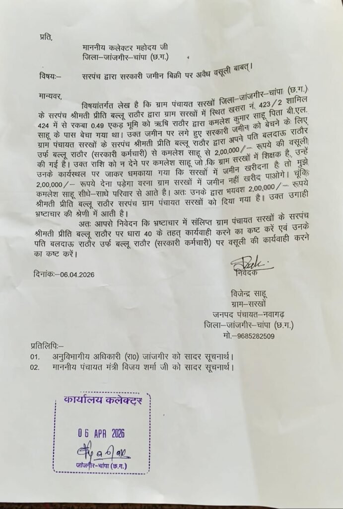डेस्क खबर ../जांजगीर-चांपा जिले के सरखों ग्राम पंचायत में सरकारी जमीन की कथित अवैध बिक्री को लेकर बड़ा विवाद सामने आया है। ग्रामीणों ने सरपंच और उनके पति पर गंभीर आरोप लगाते हुए कलेक्टर से शिकायत कर कार्रवाई की मांग की है।