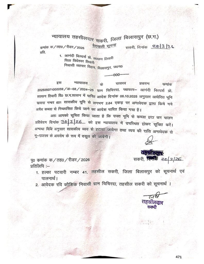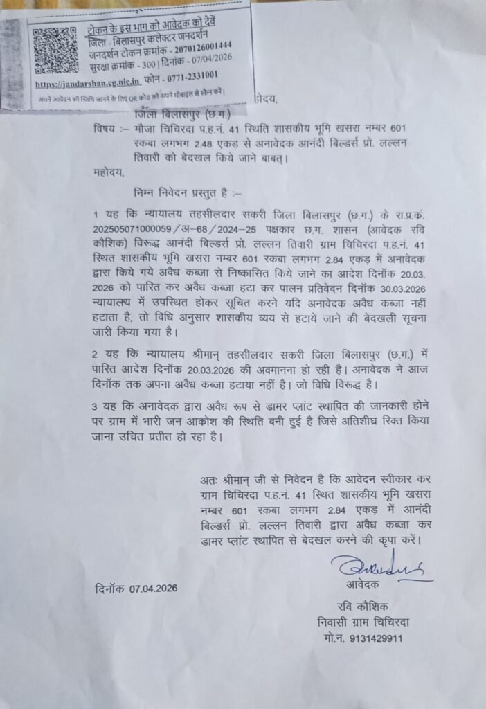 डेस्क खबर बिलासपुर../ बिलासपुर जिले के तहसील सकरी के ग्राम पंचायत चिचिरदा में शासकीय भूमि पर अवैध कब्जे का मामला अब गंभीर प्रशासनिक और राजनीतिक सवाल खड़े कर रहा है। खसरा नंबर 601 की लगभग 2.84 एकड़ जमीन पर कथित रूप से आनंदी बिल्डर्स (लल्लन तिवारी) द्वारा डामर प्लांट संचालित किया जा रहा था, जिसे लेकर तहसीलदार न्यायालय ने 20 मार्च 2026 को बेदखली का स्पष्ट आदेश जारी किया था। आदेश में निर्देश दिया गया था कि कब्जा स्वयं हटाया जाए, अन्यथा प्रशासन शासकीय खर्च पर कार्रवाई करेगा। लेकिन आदेश के बावजूद अब तक जमीन खाली नहीं की गई है, जिससे प्रशासनिक कार्यवाही की गंभीरता पर सवाल उठने लगे हैं।