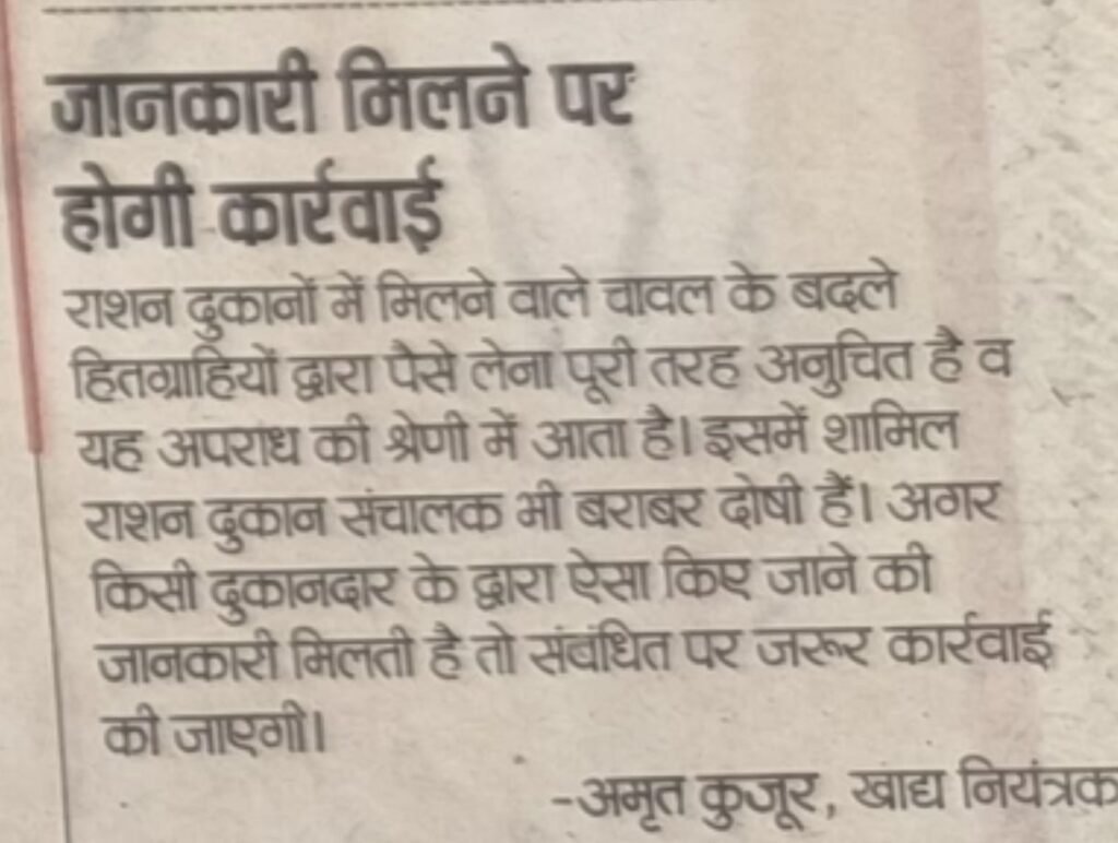 अब सरकार द्वारा तीन महीने का राशन एक साथ दिए जाने से इस खेल के और तेज होने की आशंका जताई जा रही है। एक ही बार में बड़ी मात्रा में चावल मिलने से “काले कारोबार” की चांदी होना तय माना जा रहा है। एक प्रतिष्ठित अखबार में प्रकाशित बयान के अनुसार बिलासपुर जिला खाद्य नियंत्रक अमृत कुजूर के अनुसार ऐसी गतिविधि अपराध की श्रेणी में आती हैं और जानकारी मिलने पर कार्रवाई की जाएगी। लेकिन बड़ा सवाल वही—जब सब कुछ सामने है,प्रमाण है तो कार्रवाई आखिर कब तक ? इतना ही नहीं खाद्य नियंत्रक से इस मामले में कई बार आन कैमरा बात करने की कोशिश भी की गई लेकिन खाद्य नियंत्रक कैमरे के सामने कुछ भी बोलने से हमेशा इंकार करते नजर आते है इतना ही नहीं किसी मामले की जानकारी लेने के लिए फोन रिसीव करना भी मुनासिब नहीं समझते है। चुनिंदा चावल चोर गिरोह के सरगना विक्रेता संघ अध्यक्ष ऋषि उपाध्याय के खिलाफ 6 जून को प्रसारित खबर के बाद तत्कालीन खाद्य नियंत्रक की जांच रिपोर्ट में की गई कार्यवाही मामले में मीडिया को आधा अधूरा सच बताकर मामले में पूरी चर्चा से बचते नजर आते है ,हालांकि इस मामले में ऋषि उपाध्याय के खिलाफ कोर्ट के आदेश के बाद बहाल की गई दुकान से संबंधित जानकारी लेने के लिए विभाग में सूचना के अधिकार के तहत जानकारी मांगी गई है ताकि ऋषि उपाध्याय मामले का पूरा और असल सच सामने आ सके। इस मामले में सबसे हैरान करने वाली बात है कि 6 जून के बाद भी ऋषि उपाध्याय का बेटा और स्वयं ऋषि उपाध्याय कैमरे में चावल के बदले नगद पैसा देते हुए कई बार कैद भी हो चुके है । वावजूद उसके खिलाफ कार्यवाही नहीं होने से लगातार उसकी सरकारी उचित मूल्य की दुकान के खिलाफ कार्यवाही नहीं होने से विभाग की साख पर सवाल खड़े हो रहे है ।