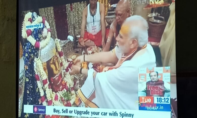 प्रधानमंत्री नरेंद्र मोदी जी के द्वारा उज्जैन कारी डोर जिसे महा लोक, नाम दिया गया आज सोमवार सायंकाल अवंतिका नाथ दक्षिणेश्वर महाकाल बाबा के मंदिर प्रांगण के भव्य नवीन रुप शिलान्यास के पूर्व माननीय मोदी जी गर्भ गिरी बाबा महाकाल की पूजा अर्चना कर देश को समर्पित महा लोक के नाम से जाना जाएगा उज्जैन बाबा मंदिर इस शिलान्यास के शुभ अवसर पर साक्षी बनने हेतु भारतीय जनता पार्टी के द्वारा स्क्रीन एवं मंदिरों में प्रकांड ब्राह्मणों के साथ बैठकर इस शिलान्यास समारोह को भारतीय जनता पार्टी दक्षिण मंडल के द्वारा विद्या नगर शिव मंदिर में बड़ी स्क्रीन लगाकर सार्वजनिक रूप से श्री श्री महाकाल के कारीगर शिलान्यास एवं आम सभा को देखा और सुना,,
