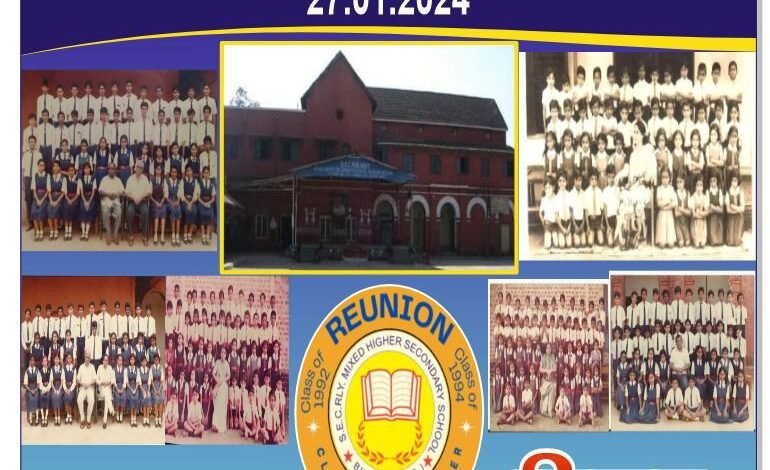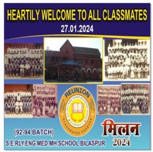 बिलासपुर के दक्षिण पूर्व मध्य रेल्वे अंग्रेजी माध्यम स्कूल नम्बर – 1 के बैच 1994 के विद्यार्थियों द्वारा भव्य पुनर्मिलन समारोह (रियूनियन) बड़े जोरदार, हर्षोउल्लास, आनंदमय वातावरण में दिनांक 27 जनवरी 2024, दिन शनिवार, स्थान रेल क्लब, रेल्वे स्टेट बैंक के सामने, तितली चौक, बिलासपुर में किया जावेगा।